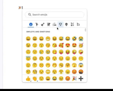 此外,您还可以在GoogleDocs中键入“@:”或“:”以获取表情符号的下拉列表,并可选择打开整个目录。它显示了公司的标准表情符号网格和类别分组。搜索栏可让您使用名称或关键字搜索所需的表情符号。