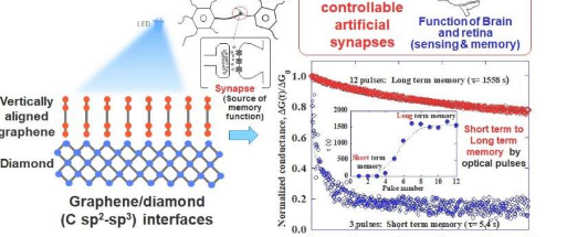 这促使名古屋大学的研究团队设计石墨烯-金刚石结,可以模仿生物突触和关键记忆功能的特征,为下一代图像传感存储设备打开大门。在他们最近发表在Carbon 上的研究中,由 Kenji Ueda 博士领导的研究人员使用垂直排列的石墨烯 (VG) 和金刚石之间的连接展示了光电控制的突触功能。制造的连接模仿生物突触功能,例如在光脉冲刺激下产生“兴奋性突触后电流”(EPSC)——突触膜上的神经递质诱导的电荷,并表现出其他基本的大脑功能,例如从短长期记忆(STM)内存(LTM)。