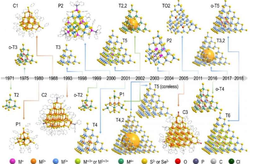 MCSCs可以细分为三种类型:1)基本-超四面体Tn簇;2) 帽超四面体 Cn 簇;3)五超四面体Pn簇. 此外,Tn簇还可以进一步诱导出一系列伪Tn簇,包括Tn(无核)簇、氧硫族化合物o-Tn簇、超超四面体Tp、q簇等。 综合起来,MCSCs的构建实际上是一个“游戏” '的电荷平衡,即ME(S,Se或Te)的配位必须遵循鲍林静电价规则才能实现簇内的局部电荷平衡,并且簇的高整体负电荷必须由外部抗衡阳离子以实现整体电荷平衡。随着 MCSC 尺寸的增加,局部和整体电荷平衡变得越来越复杂。因此,如何扩大MCSC的规模和类型一直是研究人员关注的焦点和亟待解决的难点。
