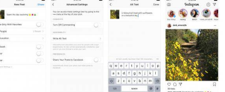 现在,如果您自己想帮助视障人士并提供上载照片的更详细说明,也可以添加自定义替代文本。发布前,只需转到屏幕底部的“高级设置”即可。您会在此处看到“写替代文本”部分,点击该部分,就可以对照片进行详细描述。使用屏幕阅读器的人将能够听到您的描述。