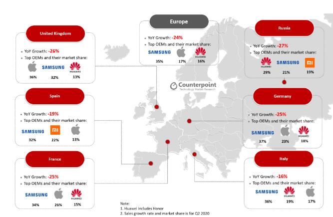 根据研究公司Counterpoint的数据,2020年第二季度欧洲的智能手机市场比去年下降了24%,比上一季度下降了22%。在欧洲市场上,三星是领先的公司,按销售量计算,其销售份额为35%,其次是苹果,份额为17%,华为位居第三,份额为16%。