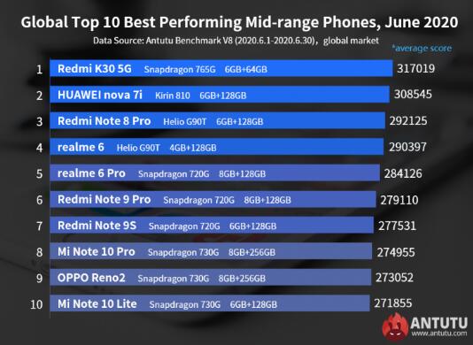 Redmi K30 5G仍然是安兔兔6月份表现最佳的中档手机